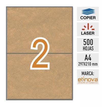 Caja de 500 hojas en papel kraft ADHESIVO. Tamaño A4 CON corte dorsal para un fácil manipulado. Medida etiqueta: 210 x 148 mm. Cantidad de etiquetas por hoja: 2 unidades. Cantidad de etiquetas adhesivas por caja: 1.000 unidades. Apto para estampar, imprimir, troquelar e incluso meter en máquinas de corte. Apto para impresoras láser, inkjet o fotocopiadora. Apta para impresoras Hp, Epson, Canon....